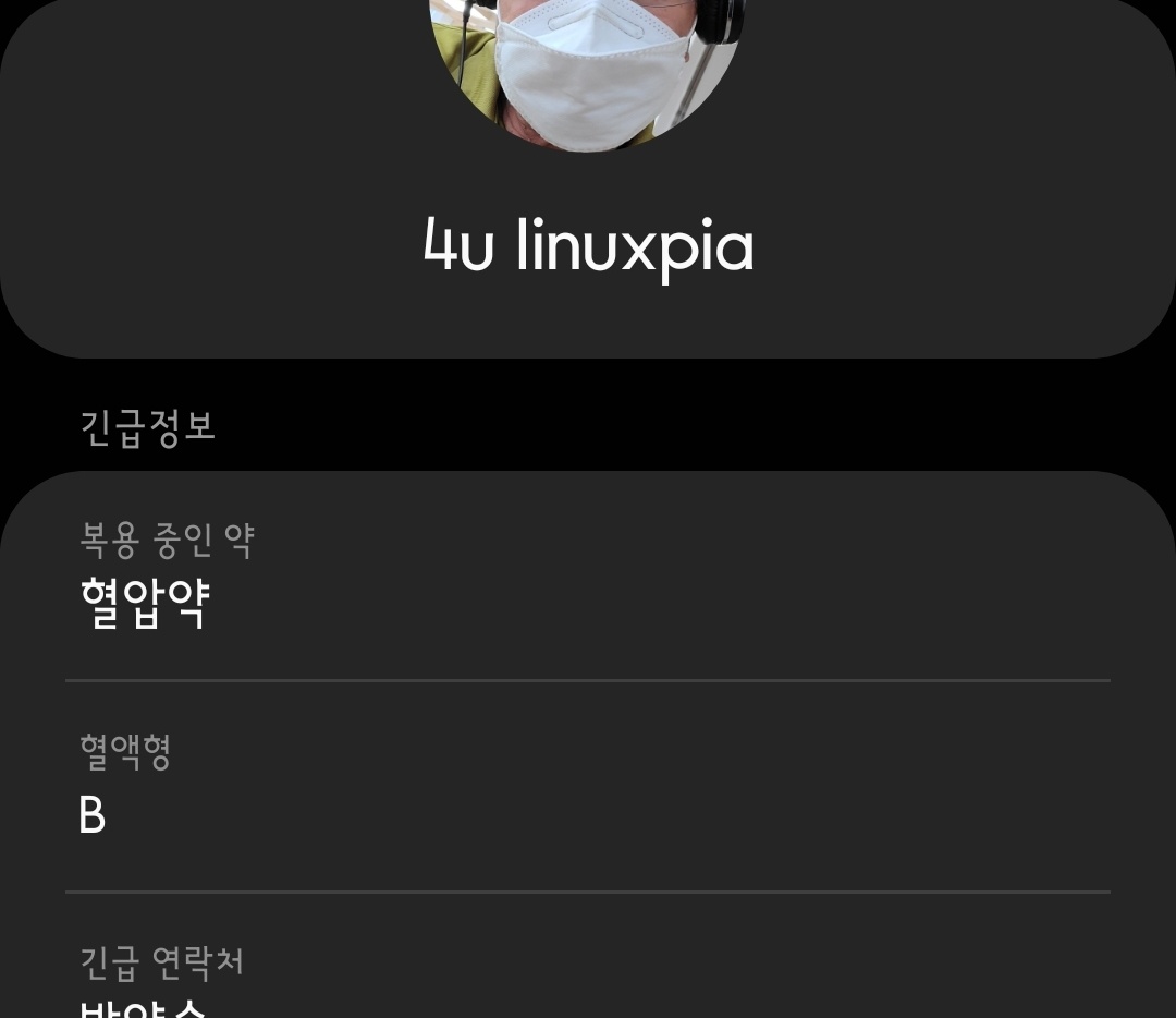 아래로 아래로 화면을 내리면 '의료정보' 입력란이 나옵니다. 아래 이미지가 등록할 정보입니다. 복용 중인 약이나 혈액형을 등록해두는 것이 좋겠죠.
