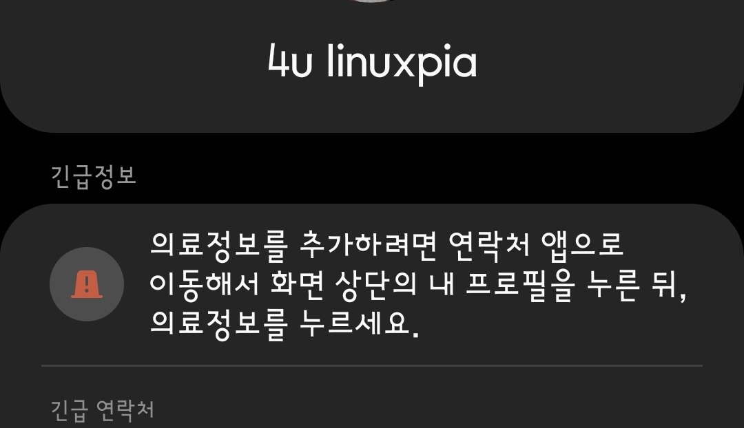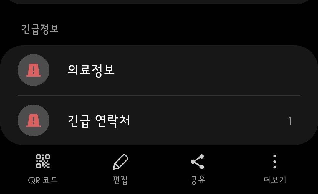 연락처 프로필을 선택합니다. 연락처 제일 위 자신을 '딱'하는 것입니다. 의료정보는 기장 아래에 있습니다.