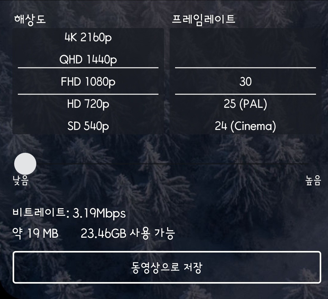 해상도는 화질입니다. 720p, 1080p, 2160p 등의 단위로 화질을 조절할 수 있습니다. 즉 가로 화면에 찍히는 픽셀의 수를 의미하기 때문에 숫자가 높으면 해상도가 높아지면서 더 선명한 화질을 즐길 수 있습니다. 픽셀이 늘어나면 자연히 용량은 커집니다. 키네마스터에서는 일반적으로 1080p를 사용합니다.