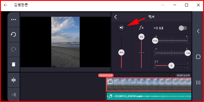 추출된 뒤의 모습입니다. 타임라인에 새로운 오디오 레이어가 생성됐습니다. 본래 영상 클립은 오디오가 음소거된 상태로 '아이콘'이 나타납니다. 소거를 해제하려면 영상 편집 상태의 '믹서'를 선택하면 해제가 가능합니다.
