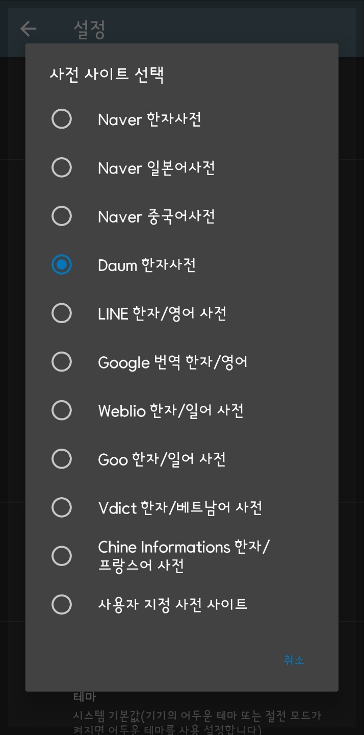 설정에서 '사전 사이트 선택'을 택합니다. 다음과 같은 사전들이 나열됩니다. 그 가운데 자신이 원하는 한자 사전을 선택하면 됩니다.