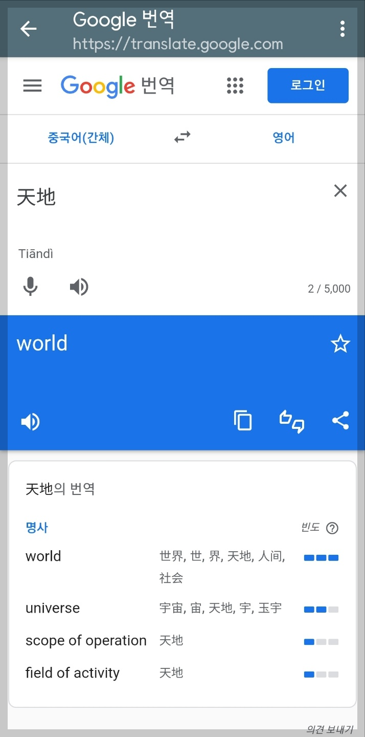 또한 구글 번역을 통해 단어 검색도 가능합니다. '天地'를 구글 사전을 통해 찾아봅니다. 아래와 같이 중국어 발음과 영어 번역을 함께 찾아 줍니다.