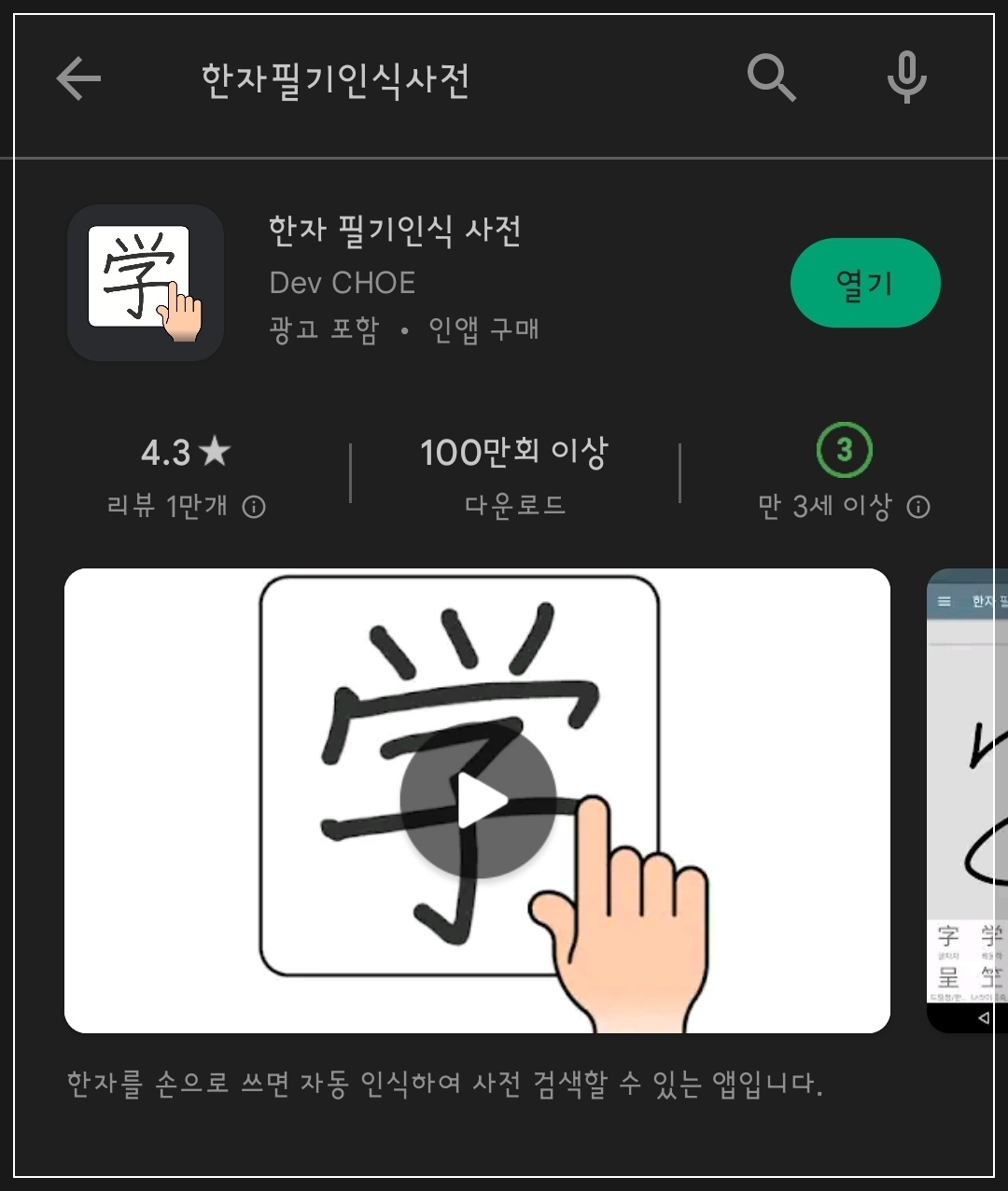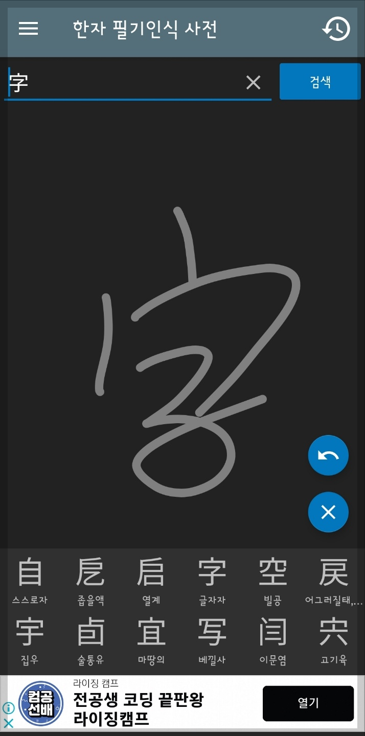 어플의 정식 명칭은 '한자필기인식사전'입니다. 아래와 같은 앱을 '구글 플레이'에서 설치하면 됩니다.