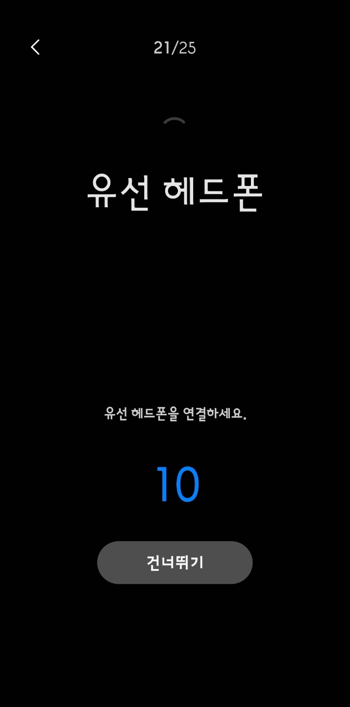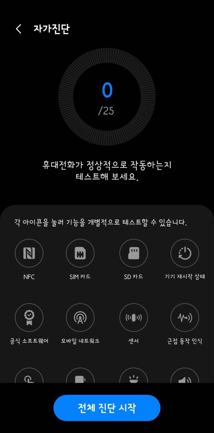 '전체 진단 시작' 버튼을 누르면 25가지 기능 모두를 점검합니다. '건너뛰는' 기능이 있으니 불필요한 경우나 시간이 많이 소요되는 경우는 '건너' 뛰세요. 제 폰에는 유선 헤드폰 지원이 안 되는 무선 블루투스 전용입니다.