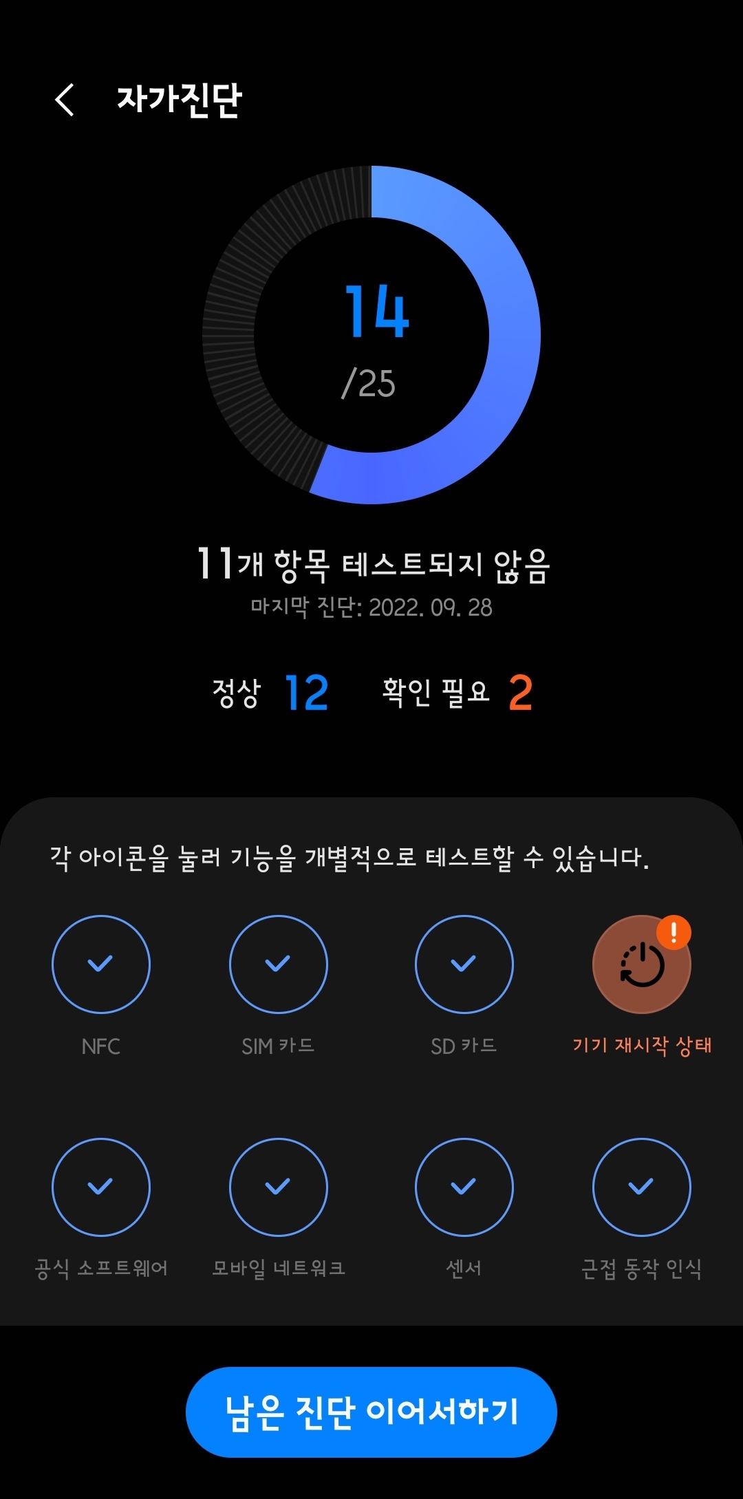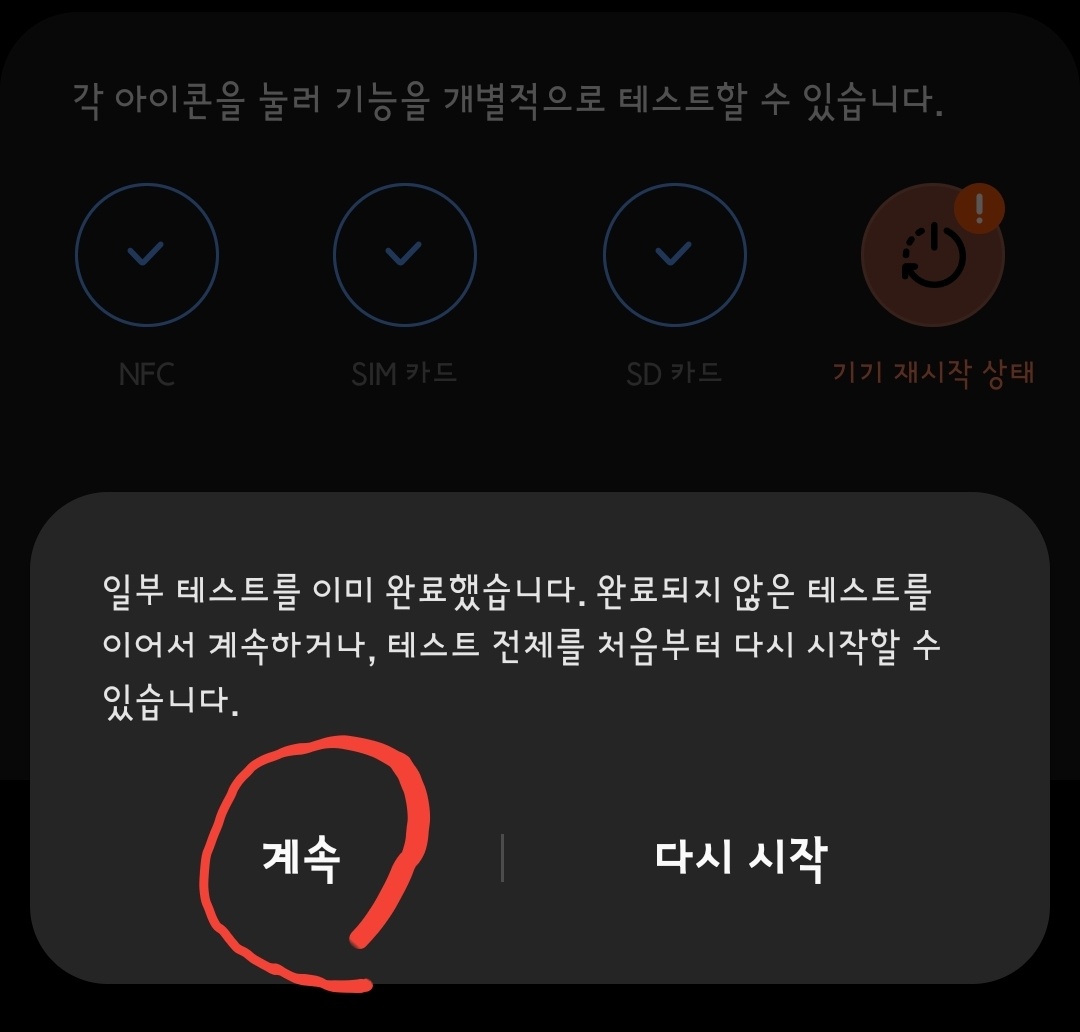 이어 진행을 하려면 '계속'을 선택합니다. 처음부터 다시 진단을 하려면 '다시 시작'을 선택하세요.