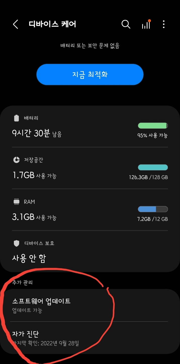 여기서 소개할 내용은 '자가 진단'입니다. 자신의 폰 상태를 점검하는 것입니다. '디바이스 케어'의 여러 항목 중에서 제일 아래 배치된 추가 관리 중 하나입니다.