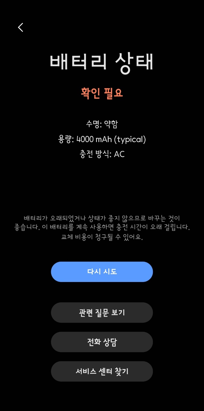 제 경우는 배터리에 문제가 있습니다. 사용한 지 2년이 넘다 보니 '배터리'에 문제가 지적됐습니다. 내일은 AS센터에 들려보려구요.