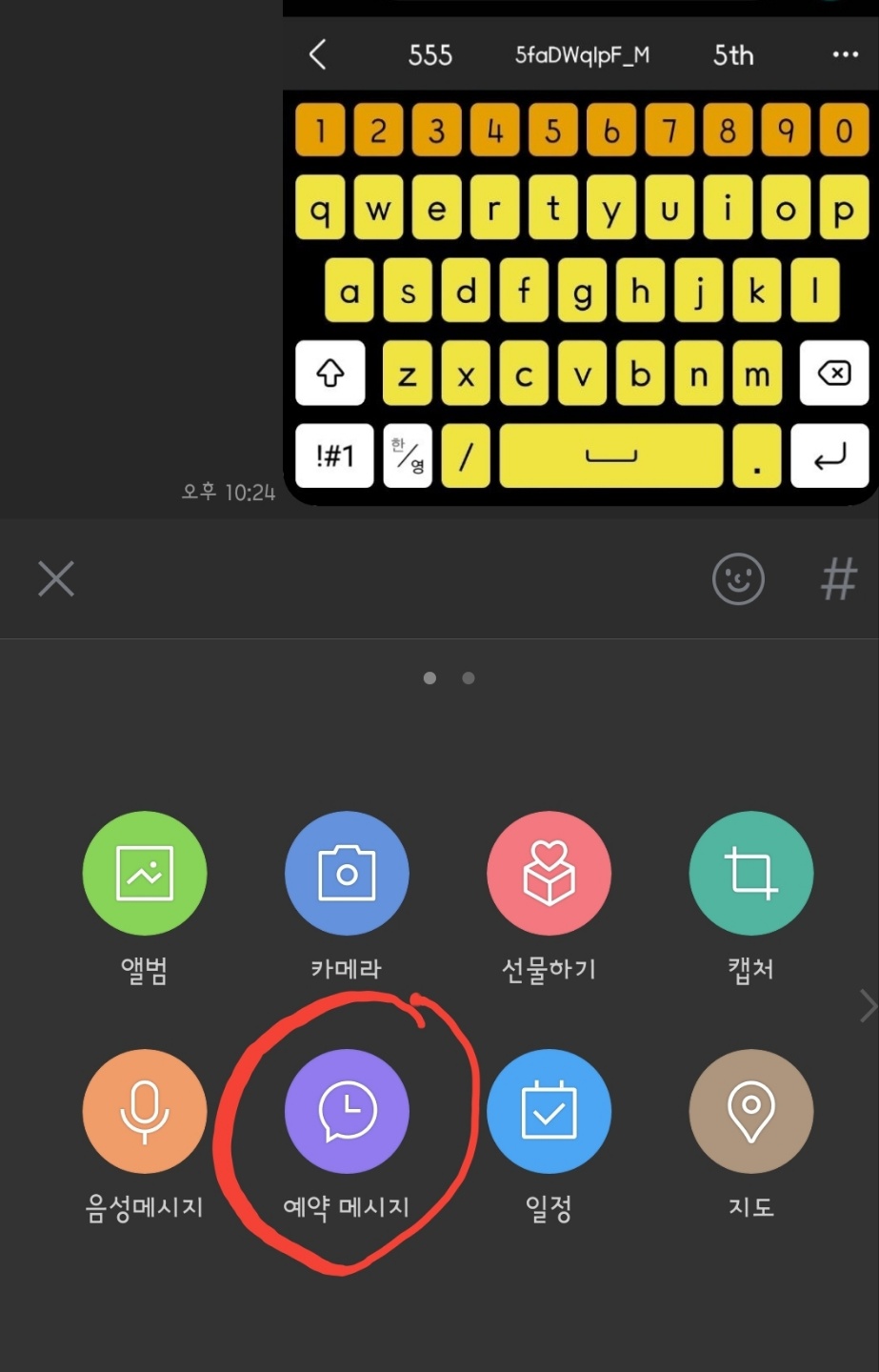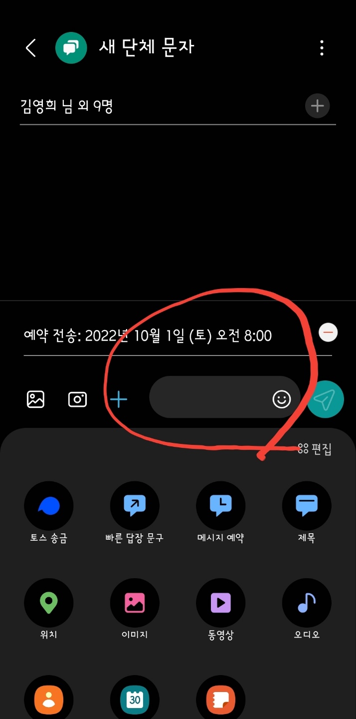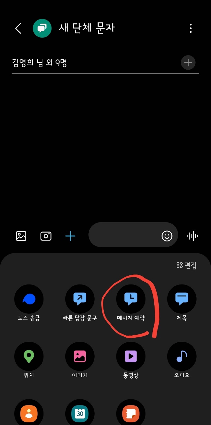 대상이 선택된 상태에서 글 박스 옆 '+'를 탭 합니다. 많은 메뉴가 나옵니다. 그 가운데 '메시지 예약'이 있습니다.