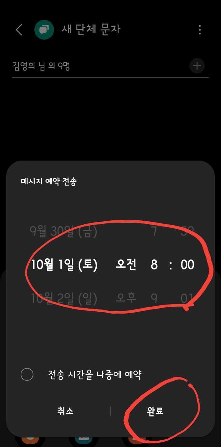 '메시지 예약' 창이 나옵니다. 이곳에서 '일시'를 선택하고 완료를 탭 합니다. 다시 메시지 작성 상태로 복귀됩니다.
