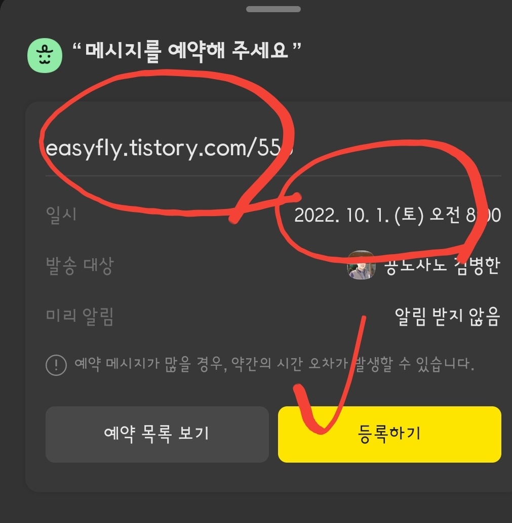 모든 준비가 끝나면 '등록하기'를 택해 예약을 마칩니다. 문자와 달리 카톡 창에서는 바로 보이지 않고 다시 '예약 메시지'를 선택해야 목록을 볼 수 있습니다.