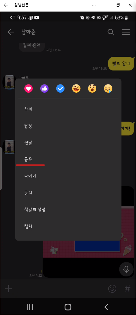 카톡의 기능 중에는 '전달'과 유사하지만 다른 '공유' 메뉴가 있습니다. '공유'는 '전달'이 같은 카톡에서 친구에게 전달하는 것과 달리 다른 어플을 통해 컨텐츠를 공유하는 기능입니다. 메시지나 페이스북 등의 다른 메신저를 통해 공유할 수 있는 기능입니다.