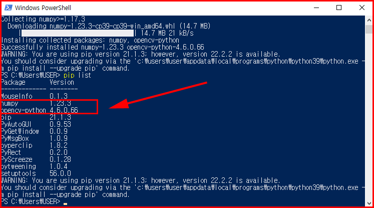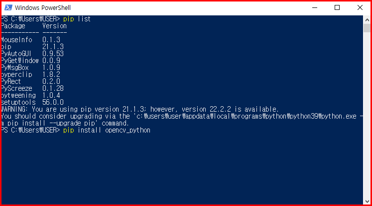 먼저 PyAutoGUI를 설치합니다. PyAutoGUI 내부에서 사용되는 OpenCV, Pillow 모듈도 함께 설치합니다. 커맨드라인을 열고 다음 명령어를 입력합니다. 여기 커맨드라인이란 윈도즈 운영체제가 지원하는 터이널을 말합니다. 'pip'는 '파이썬을 관리하고 열람하는 저장소'입니다. 아이폰의 '앱스토어', 안드로이드폰의 '플레이스토어'에 해당됩니다. 자신의 컴퓨터에 파이썬의 어떤 모듈이 설치됐나를 확인하려면 'pip list'로 확인합니다.
