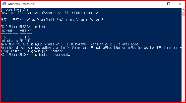 처음에 'pip list'를 통해 확인했습니다. 두 개의 모듈만 설치되어 있군요. 'pip'와 'setuptools' 두 개.