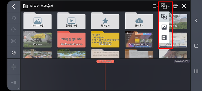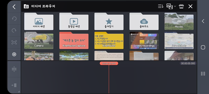 레이어나 오디오, 녹음이 비활성화되어 있고 빨간 동그라미의 [미디어]만 활성화 되어 있는 것을 볼 수 있습니다. 그 이유는 이 기본 미디어가 첫번째 레이어에 배치되어야 다른 작업을 할 수 있음을 의미합니다. 이것은 대단히 중요한 사실입니다. 키네마스터에서 기본은 바로 첫번째 레이어의 기본 미디어 배치라는 것을...