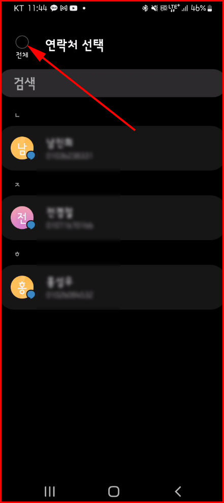 그룹 선택 창이 열리면 '전체'를 클릭하여 모두 선택하겠습니다. 이 부분에서 '카카오톡'과 차이가 있습니다. 카카오의 단체 카톡에서는 선택한 멤버들을 따로 추가나 제외가 어렵습니다. 그러나 삼성 메시지에서는 전체 선택 후에 제외할 멤버들을 가려낼 수도 있고 멤버 이외의 인물도 추가할 수 있습니다. 카카오톡보다 더 다양한 조합을 구성해서 문자를 발송할 수 있습니다.