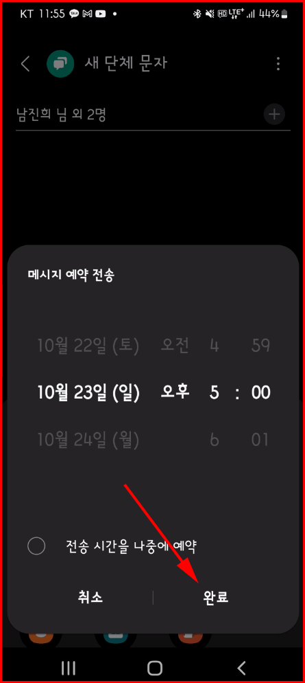 메시지 예약 기능을 활용하면 적절한 시간에 메시지를 보낼 수 있어 효과적입니다. 모임이 있기 일주일 전에 모임 시간에 맞춰 발송되게끔 예약을 하렵니다. 문자를 타이핑하기 전에 날짜와 시간을 먼저 맞춥니다. '완료'를 누르면 그때 메시지를 작성할 수 있습니다.