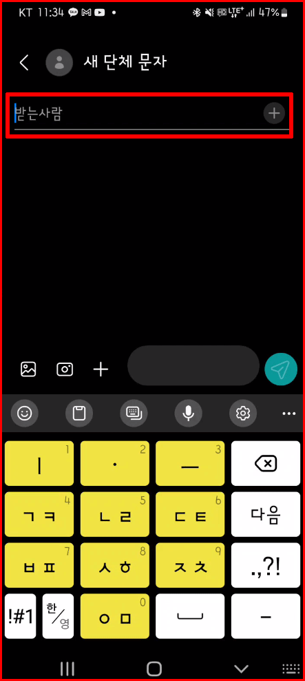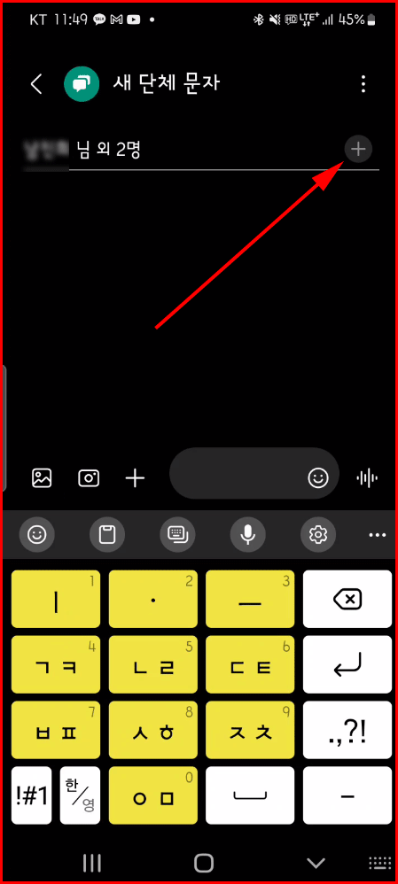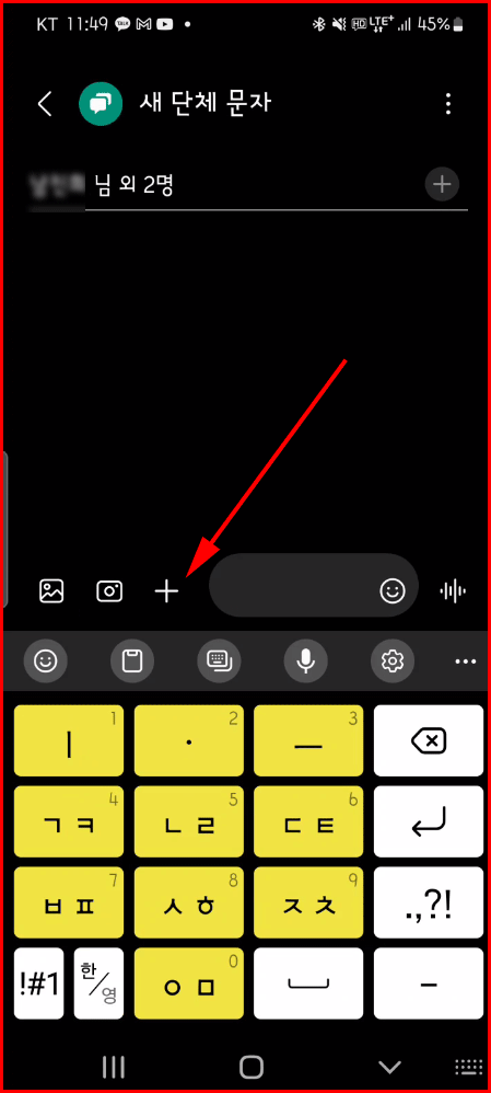 연락할 문자는 아래 대화 상자에 글을 작성하면 됩니다. 저의 경우는 예약해서 보낼 계획이기에 대화창 옆에 있는 '+' 버튼을 터치합니다. '+'는 '더보기'입니다. 문자를 보낼 때 더 많은 기능이 있다는 얘기입니다.