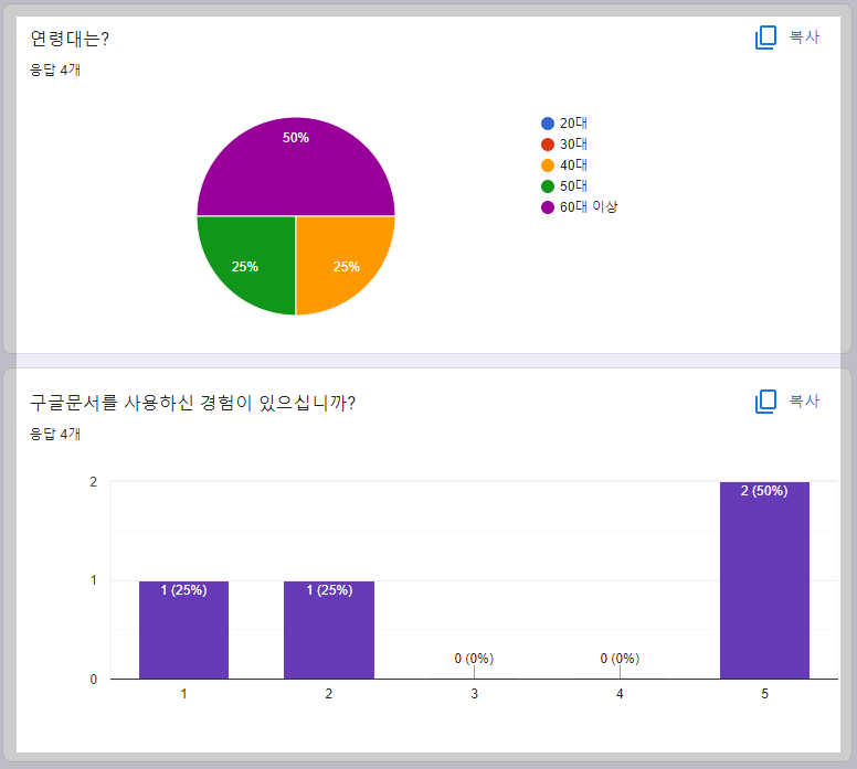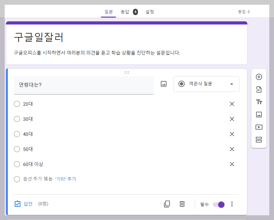 설문을 작성하면 위와 같은 설문지가 작성되고 메일이나 링크를 생성해 대상자에게 보내면 설문조사가 진행됩니다. 수업이 시작되지 1주일 전에 설문지를 링크로 보냈습니다. 보낸 메신저는 '카카오 단톡방'이었습니다. 하루 지난 글 작성 현재 응답자는 4명이군요. '응답' 항목으로 가보겠습니다.