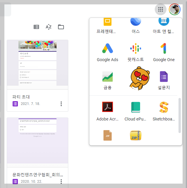 지메일에 로그인된 상태에서 브라우저 우상단에 생긴 '구글 큐브'를 선택하면 다양한 구글 서비스를 만날 수 있습니다. 그중에 하나가 '구글 설문지'입니다. 큐브에 사용된 이름은 '설문지'이군요. 최근에 작성된 설문지 '구글일잘러'를 선택했습니다. 11월 10일부터 진행되는 배움터 온라인 강의 진단을 위한 설문 작성이었습니다.