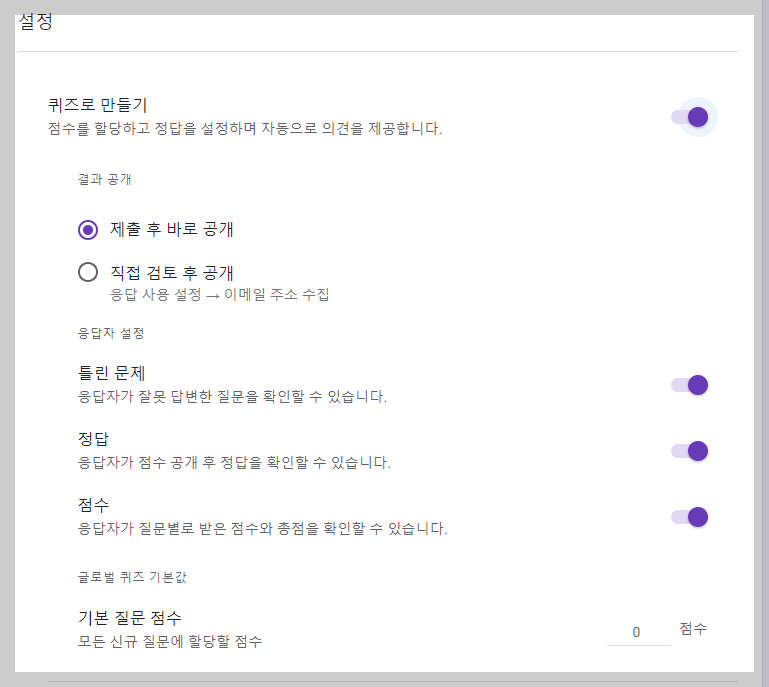 '퀴즈 만들기' 여부가 있습니다. '퀴즈'로 만들면 응답자의 응답 결과에 대한 피드백이 이뤄집니다. 학교 수업에서 형성평가나 총괄평가를 하는 경우에 이것을 선택하면 좋겠군요.