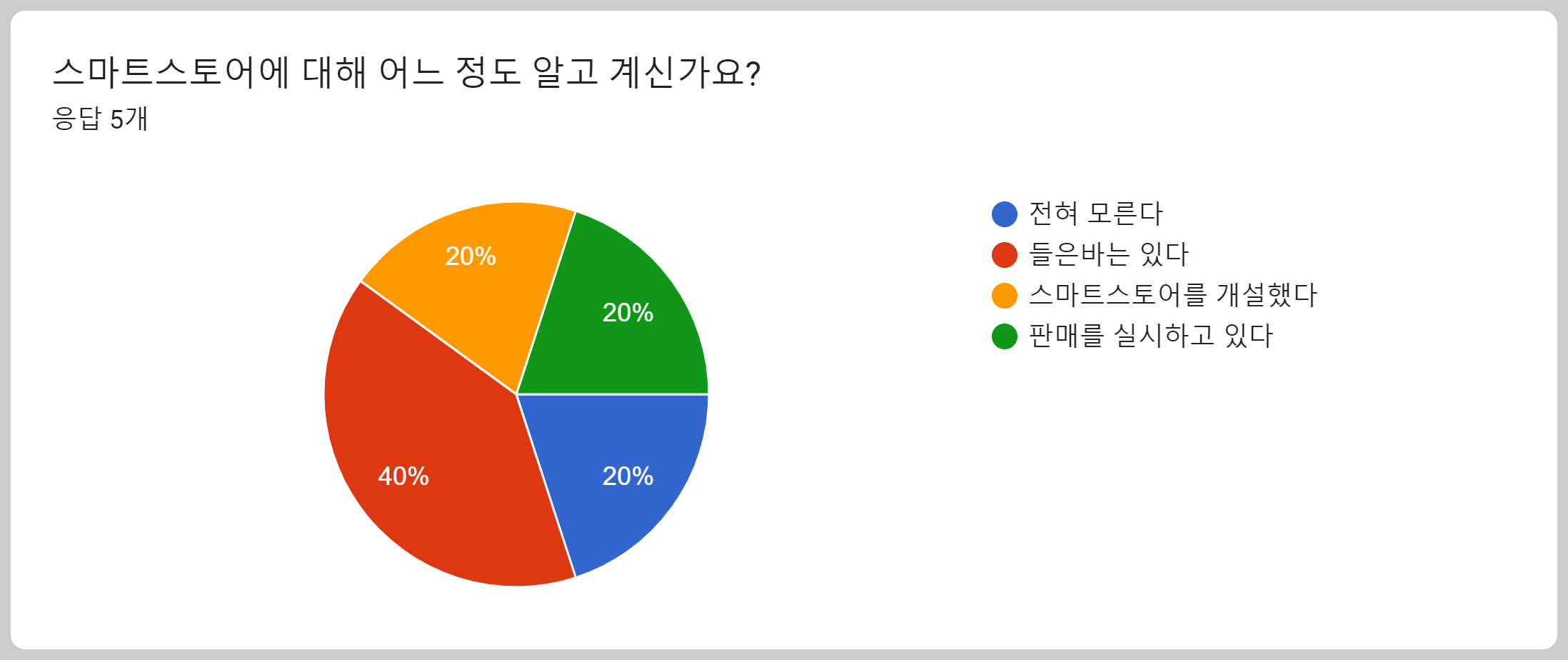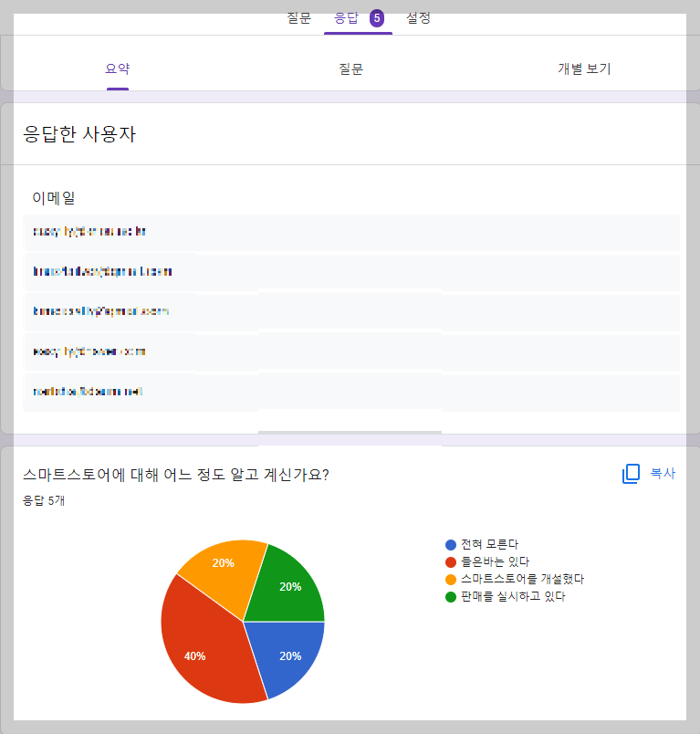 응답 결과는 응답한 5명의 이메일 계정과 스마트스토어에 대한 인지 여부를 그래프로 처리한 결과가 출력됐습니다. 스마트스토어를 전혀 모르는 분도 한 분 있었고, 판매를 실시하는 분도 한 분 있다는 결과입니다. 사실, 이런 대상을 온라인에서 함께 지도한다는 것은 어려움이 큽니다. 개인차가 너무 커서 그 강의는 '스마트스토어' 개설을 해서 운영하는 학습자의 양해를 구하고 기초부터 학습을 진행했던 기억이 있습니다.