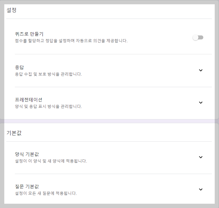 퀴즈를 선택하지 않은 경우는 일반적인 여론 수집 등의 설문이 되겠습니다. 응답 수집 및 보호 방식과 프레젠테이션 방식을 정하는 항목들이 열거되고, 퀴즈와 관련된 점수를 매기는 항목은 사라집니다.