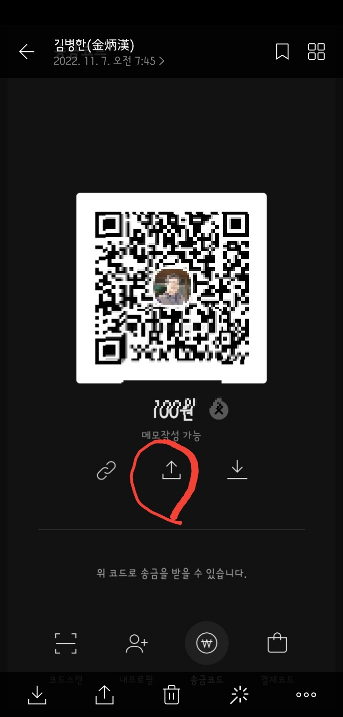 아래 항목에서 세 번째 '송금코드'를 선택합니다. '받을 금액 입력'을 탭 하여, 송금받을 금액을 기록합니다. 물론 메모도 함께 작성할 수 있습니다. 메모의 길이는 최대 12자입니다. 작성이 끝나면 QR이 변경됐다는 메시지가 잠시 나오고 화면이 리로드 됩니다. 금액에 대한 정보가 추가되어 갱신되는 것입니다.