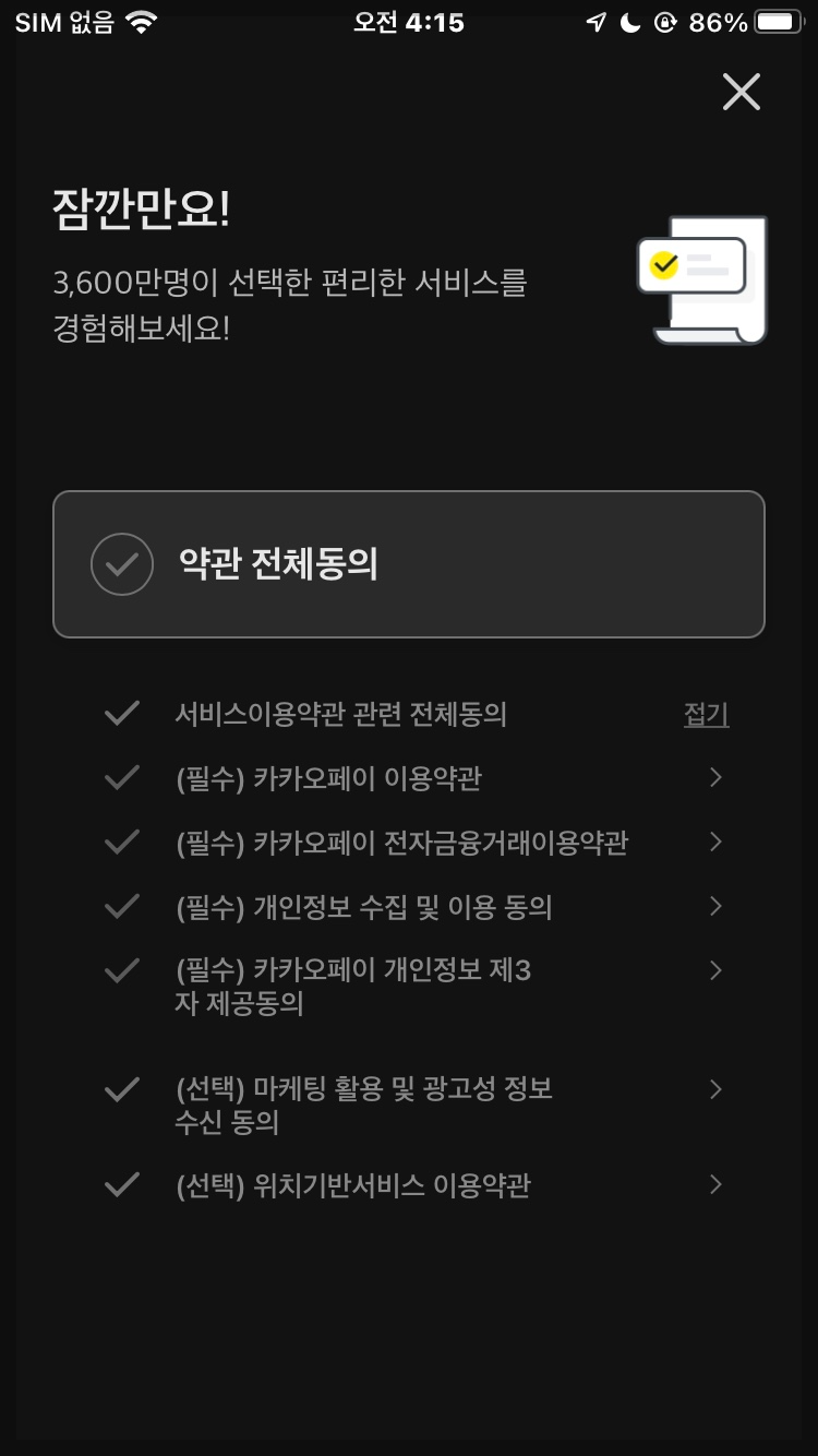 카카오페이 서비스를 이용하지 않는 사용자라면 아래와 같은 서비스 신청 메뉴로 이행됩니다.
