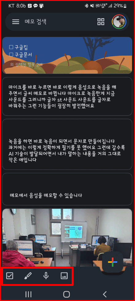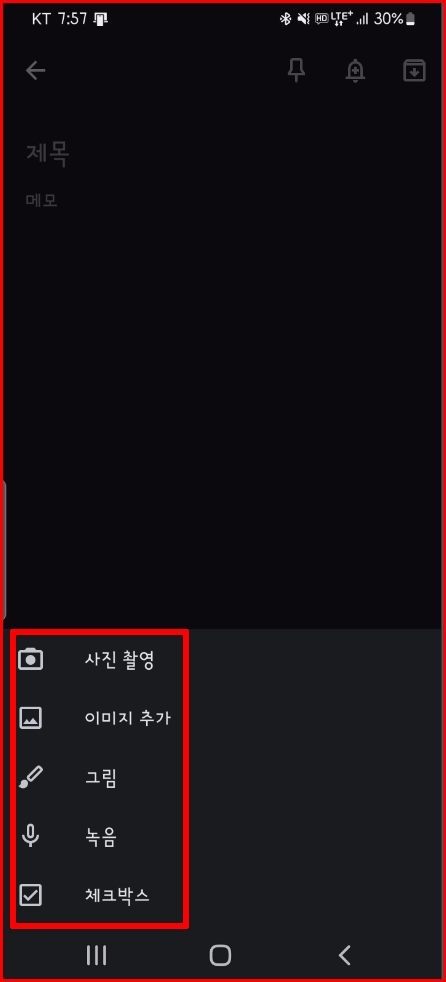 다른 두 가지 퀵도구는 손글씨를 쓸 수 있는 펜 도구와 사진을 찍거나 폰에 저장된 이미지를 선택할 수 있는 퀵도구도 있습니다. 키보드를 이용한 글씨 입력 외에 가장 유익한 도구는 체크리스트와 음성녹음입니다.