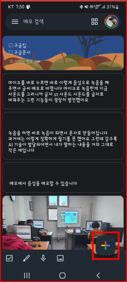 새 메모 작성은 구글 다른 어플과 마찬가지로 '빨파초노'의 색이 조합된 플러스(+) 아이콘을 눌러 시작합니다. 기본적인 텍스트 입력 화면으로 시작됩니다. 밋밋한 텍스트를 입력할 수 있는 환경이지만, 아래 네모 속 '+'를 누르면 다양한 입력 방법을 선택할 수 있습니다.