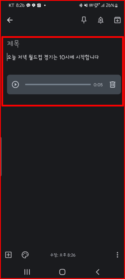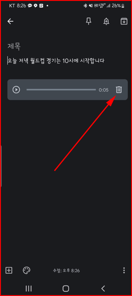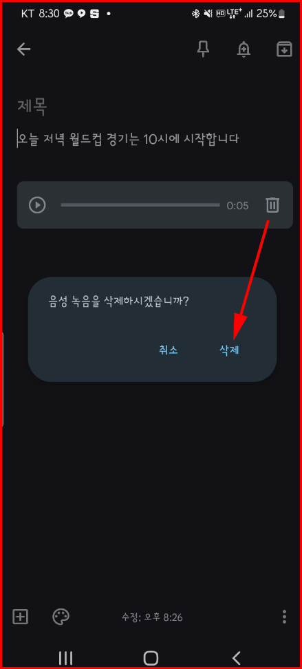 메모 결과는 AI로 음성을 텍스트로 변환된 결과와 음성 메모를 동시에 남기고 있습니다. 만약 텍스트만 남기려고 한다면 음성 메모 오른쪽에 있는 '휴지통'을 이용해 버리면 됩니다.
