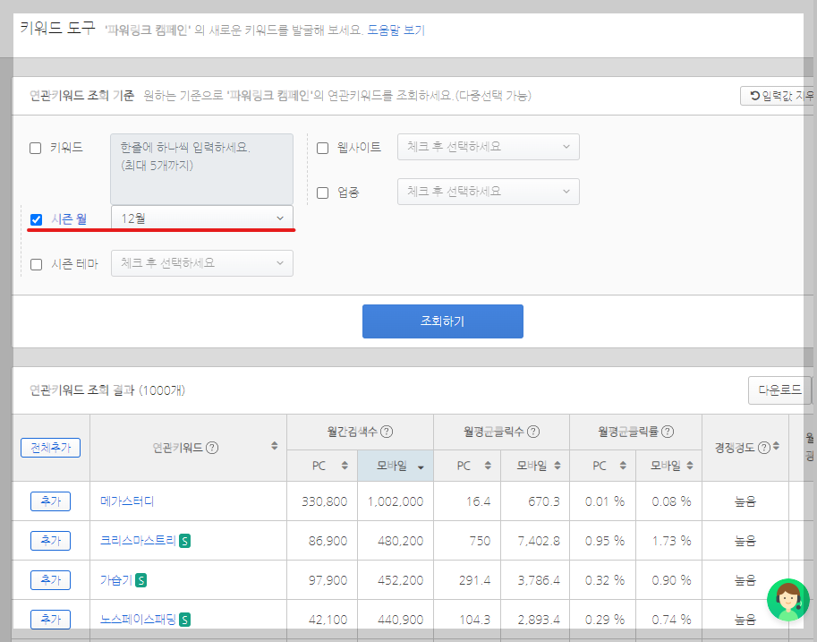 네이버광고의 키워드도구를 열면 키워드 입력 텍스트박스 아래에 '시즌 월'을 선택하는 드롭다운바가 나옵니다. 거기서 다가오는 12월을 선택했습니다. 조회 결과는 무려 1,000개의 연관키워드를 보여줍니다.