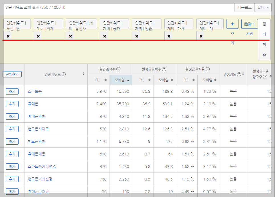 조금 더 좁히기 위해 필터링을 다양하게 시도합니다. 필터링이란 처음 찾아진 많은 키워드 중에 '포함', '제외'를 통해 자신이 원하는 키워드로 범위를 좁히는 과정입니다. 불필요한 낱말은 '제외'를 통해 버립니다. 여기서는 '매매'라든가 '공짜', '가격' 등을 제외하고 나머지만 찾았습니다.