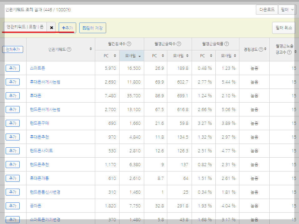 역시 조회 결과는 1,000개나 되군요. 필터링을 합니다. '폰'을 포함한 경우만.