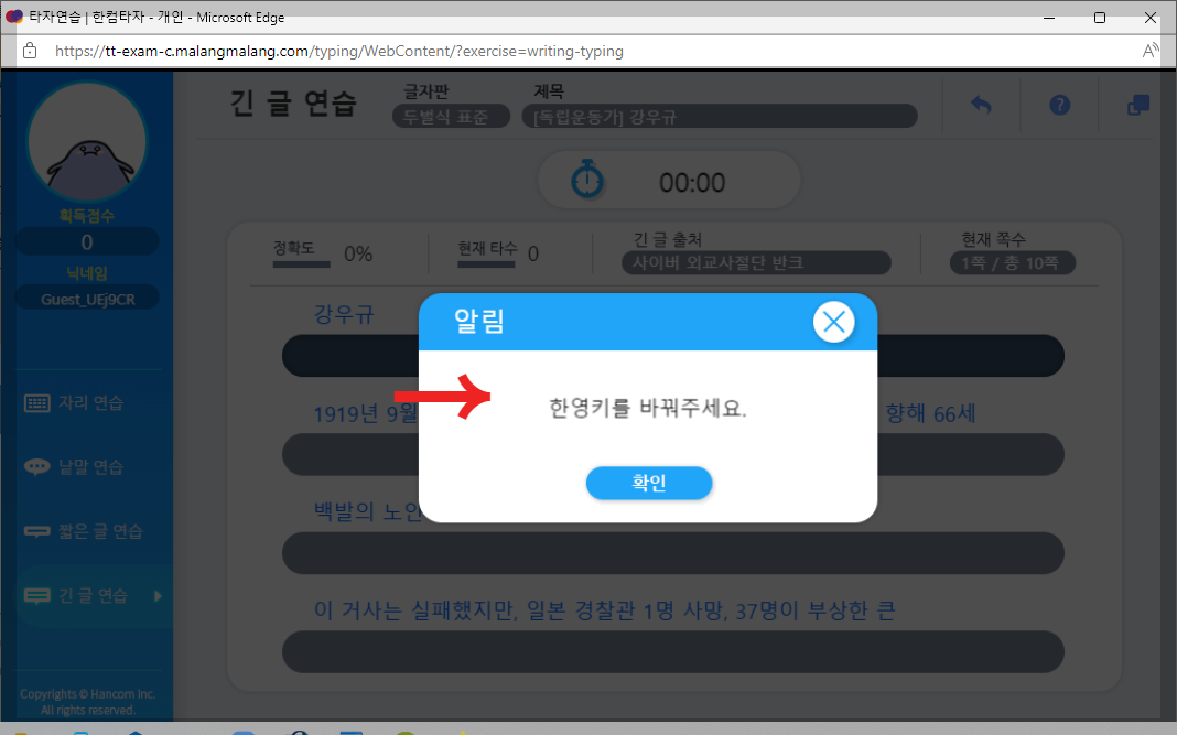 그러나 다음과 같은 알림을 받는 경우가 있습니다. 한글 타자이기에 컴퓨터 글자판을 한글로 바꿔서 진행하면 '한영키를 바꿔주세요'라는 팝업이 나타납니다. 이것은 영문 상태에서 이 프로그램은 가능하기 때문입니다. 한글을 연습하는데 영문 상태라? 좀 이상한 현상인데 이 프로그램이 독자적으로 실행되는 것이기에 환경이 한글 상태에서 진행이 안됩니다.