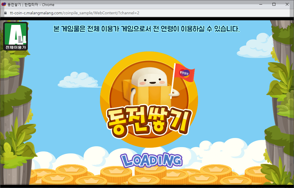 '자리 연습, 낱말 연습, 짧은 글 연습, 긴 글 연습'의 연습 프로그램과 '게임'이 있습니다. 그런데 여기서 문제가 있군요. 팝업 형태로 프로그램이 올라오는데 팝업을 차단한 브라우저에서는 아래와 같은 프로그램 로딩이 안 되는 것입니다.