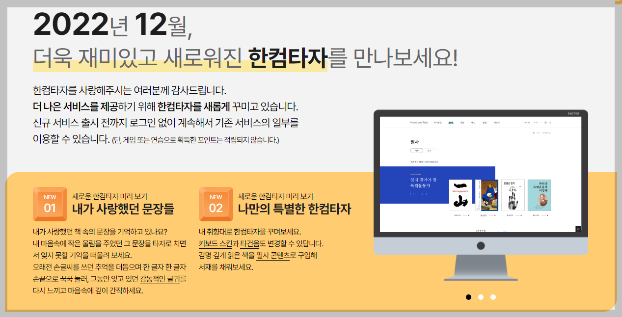 2022년 12월 '더욱 재미있고 새로워진 한컴타자를 만나보세요!'라는 알림이 나옵니다. 오늘이 12월 2일인데 아직 새로운 한컴타자가 등장했다는 소식은 없습니다. '필사 텍스트'에 대한 안내글을 보니 상당한 변화가 느껴집니다. 오래전 손글씨 추억을 끄집어내겠다는 약속도 있군요.