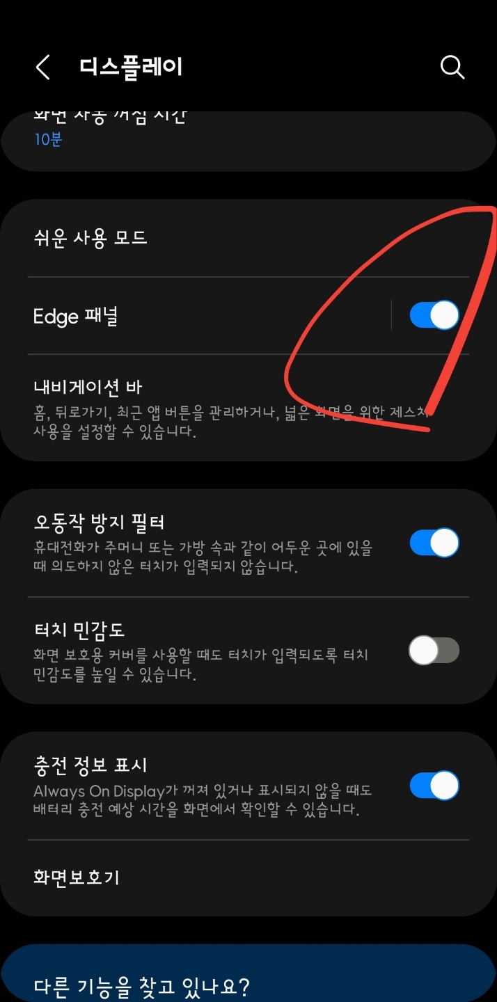 Edge 패널 사용 여부를 결정하는 것도 스마트폰 설정의 '디스플레이'에서 정합니다. Edge 패널이란 화면의 가장자리를 이용하는 것입니다. 가장자리에 자그마한 Edge 패널을 두어 활성화시키면 다양한 사용 방법이 제공됩니다.