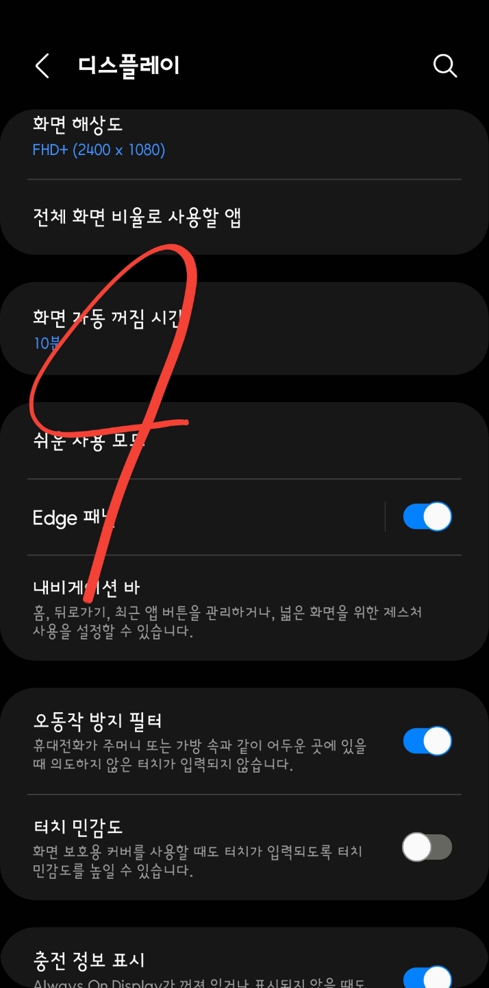 '화면 자동 꺼짐'은 폰 사용을 일정 시간 동안 하지 않을 경우 화면을 꺼서 화면을 보호하고 배터리 방전도 막자는 취지입니다. 그러나 학습 중에 화면이 자주 꺼지면 자주 화면을 깨워햐 하는 번거로움이 있습니다. 저는 10분으로 해두고 있습니다. 학습 상황이 많기 때문에 취한 조치입니다. 보통은 2분 정도가 적당하지 싶습니다.