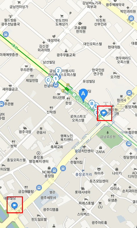 지도에 CCTV를 의미하는 까만 바탕에 하얀색의 캠 아이콘이 보이죠. 이것이 캠이 설치된 장소입니다. 여기서는 금남로4가역의 CCTV를 선택하겠습니다.