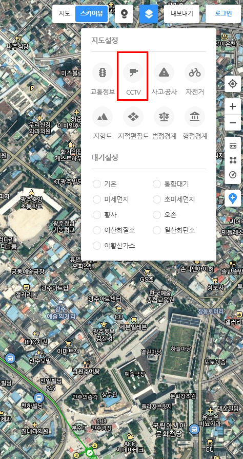 지도에 표시된 [캠]을 잘 보이게 [스카이뷰]를 끄도록 하겠습니다(스카이뷰란 일반지도 위에 항공사진을 겹쳐 보여주는 것). 금남로4가역 근처와 중앙교 부근에 CCTV가 설치되어 있음을 알 수 있죠.