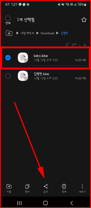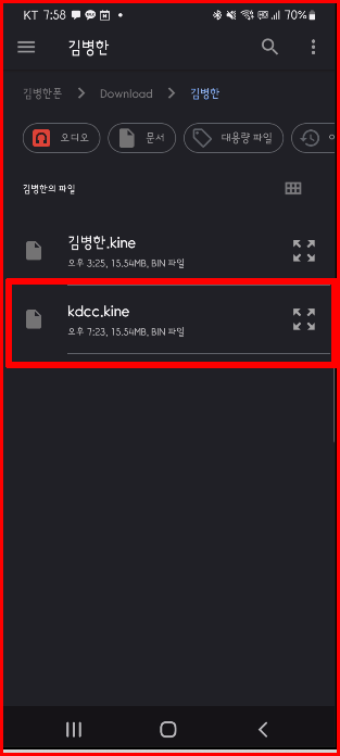 내보내기 성공 후 파일을 확인해보면 다음과 같이 허용했던 폴더 아래 자신의 키네마스터 프로젝트 파일이 'kdcc.kine' 이름으로 만들어진 것을 알 수 있습니다. 만들어진 일시와 더불어 용량이 나옵니다. 키네마스터 프로젝트 파일은 프로젝트 정보뿐만 아니라 프로젝트에 사용된 소스까지 압축해서 포함시켰기 때문에 소스 폴더를 따로 준비할 필요가 없습니다.
