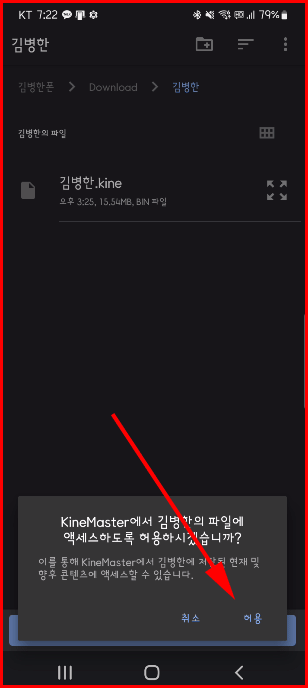 저장할 폴더를 사용하겠다는 버튼을 선택하면, '액세스 하도록 허용' 하겠냐고 묻습니다. '허용'을 선택하여 진행합니다. 'kine 파일로 내보내기 성공'이라는 메시지가 떠야 성공한 것입니다.