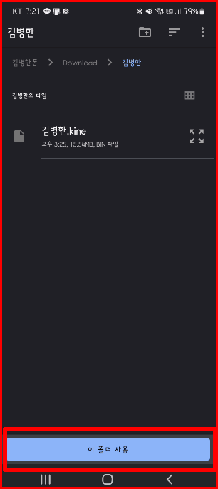불러오기를 선택하면 폴더를 찾게 됩니다. 만약 카카오톡에서 키네마스터 프로젝트 파일을 받아 다운로드했다면 '내 스마트폰 저장 공간'의 'KakaoTalkDownload' 방에 파일이 있습니다. 카카오톡의 경우는 카톡 자신만의 독특한 방식으로 다운로드를 하게끔 환경 설정이 되어 있습니다. 메일로 받은 경우는 일반적으로 자신의 내장 메모리 'Download' 방에 다운이 됩니다.