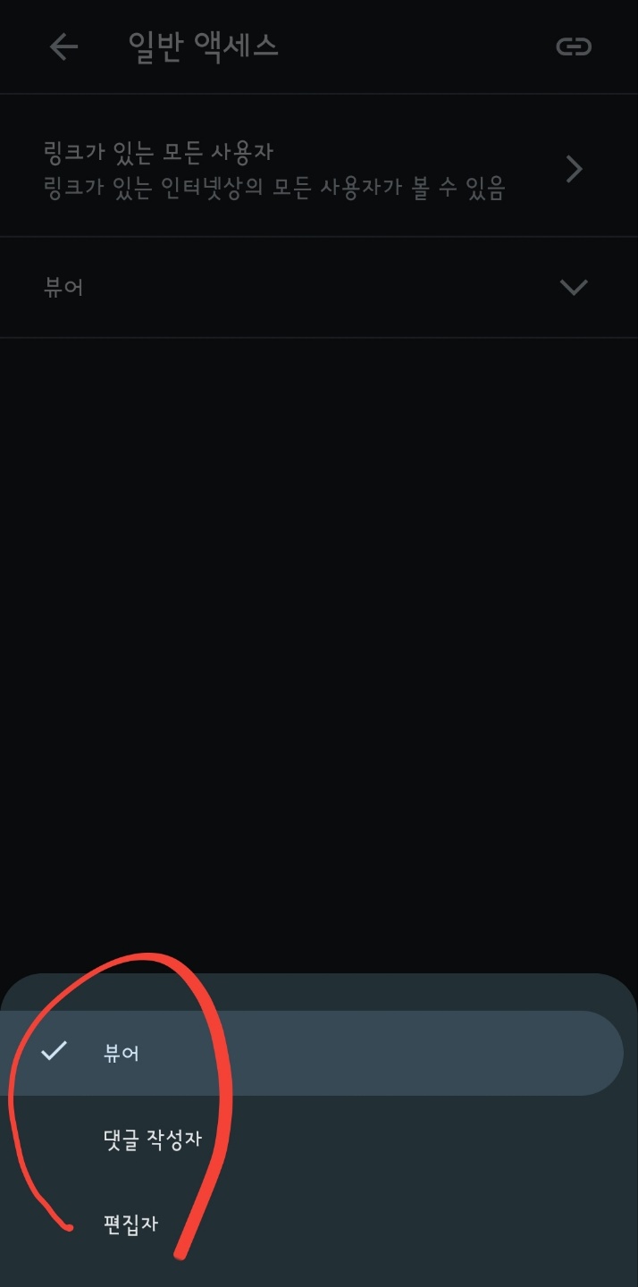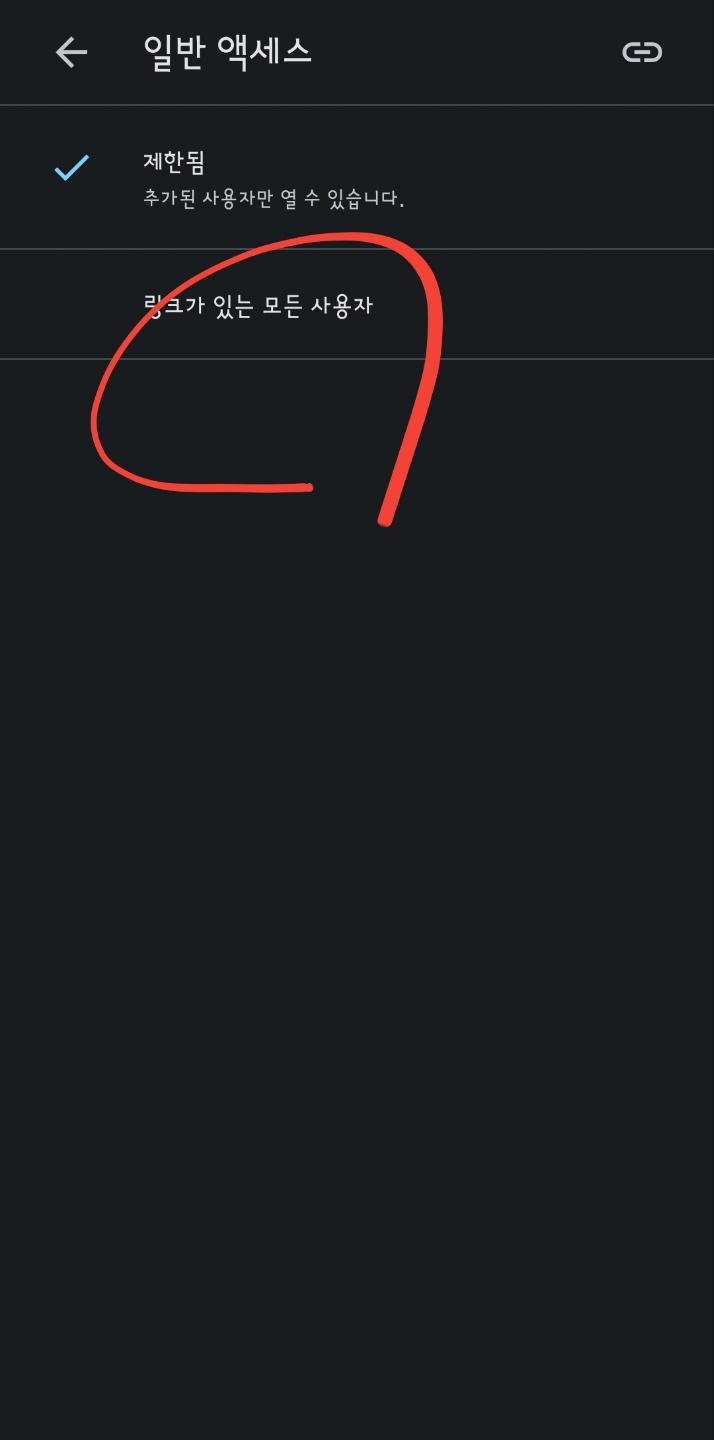 화살 머리에 의해 나타난 두 항목에서 '링크가 있는 모든 사용자'로 체크를 바꿉니다.
