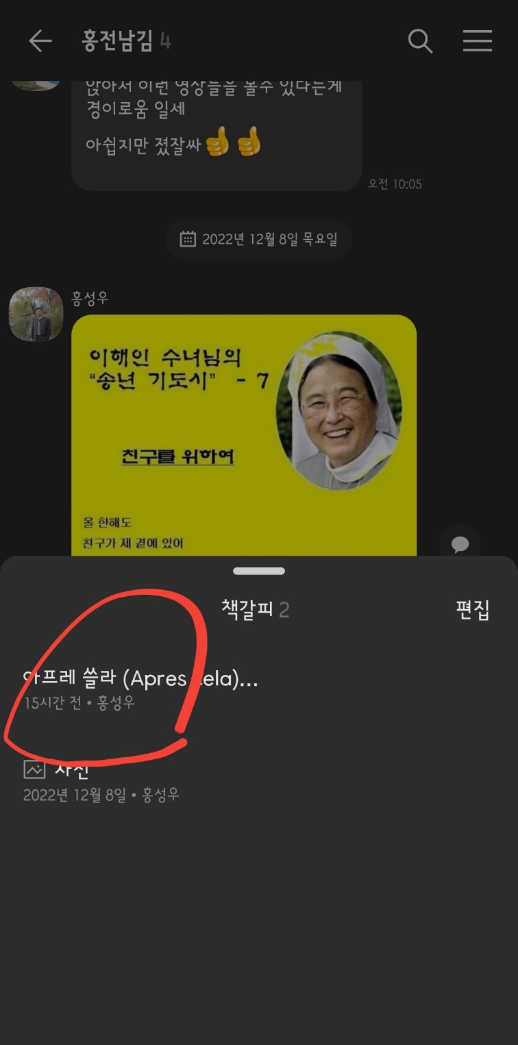 원하는 책갈피를 선택하면 그곳으로 이동됩니다. 사진을 책갈피로 설정한 경우는 '사진'과 보내온 일자가 나옵니다. 텍스트는 친절하게 글의 앞부분과 일자를 표시하네요.