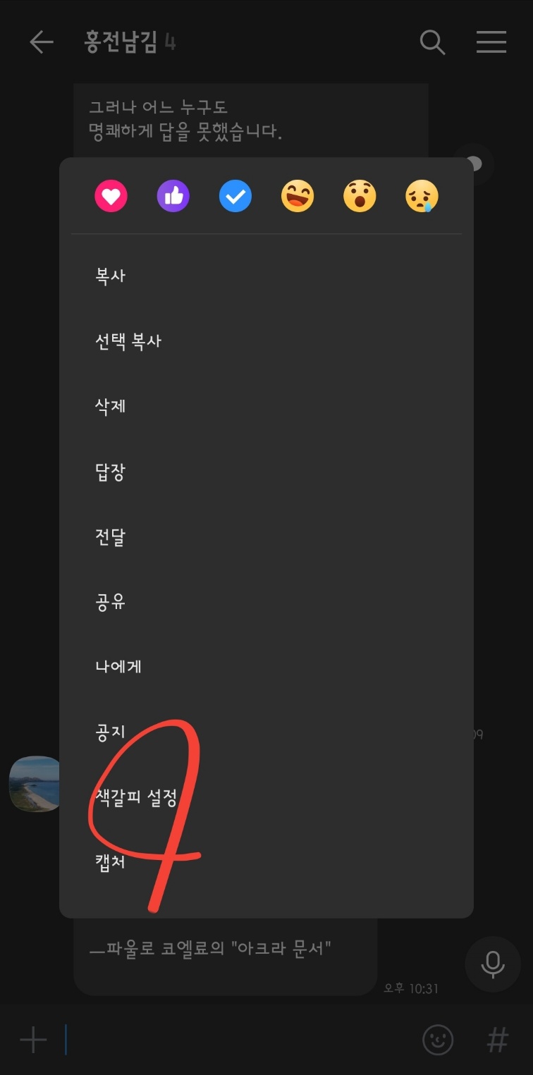 이 글에 책갈피를 하려구요. 길게 눌러 나타난 팝업 메뉴에서 '책갈피 설정'을 탭 합니다. 책갈피가 설정되면 채팅방 아래에 책갈피 모양의 아이콘이 생깁니다.