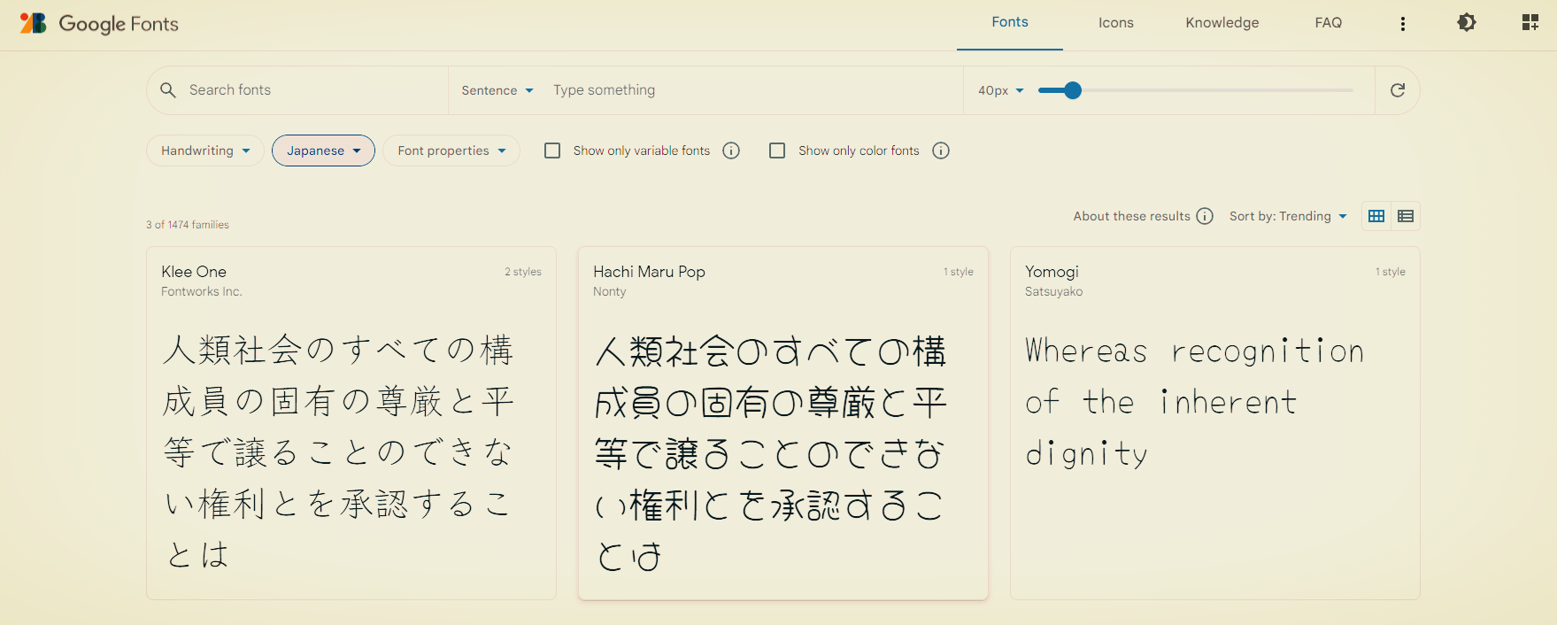 아래에 적용 사례를 구글에서 제공한 것을 펼쳐봅니다. 게 중에는 한자가 없는 폰트도 있습니다.
