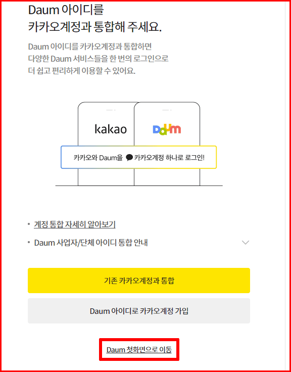계속되는 통합 권유 메시지는 무시합니다. 'Daum 첫화면으로 이동'을 클릭합니다.