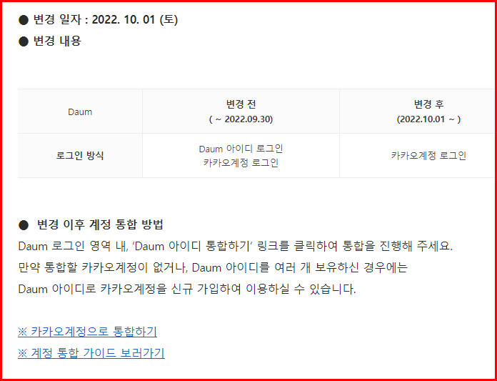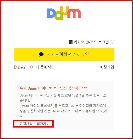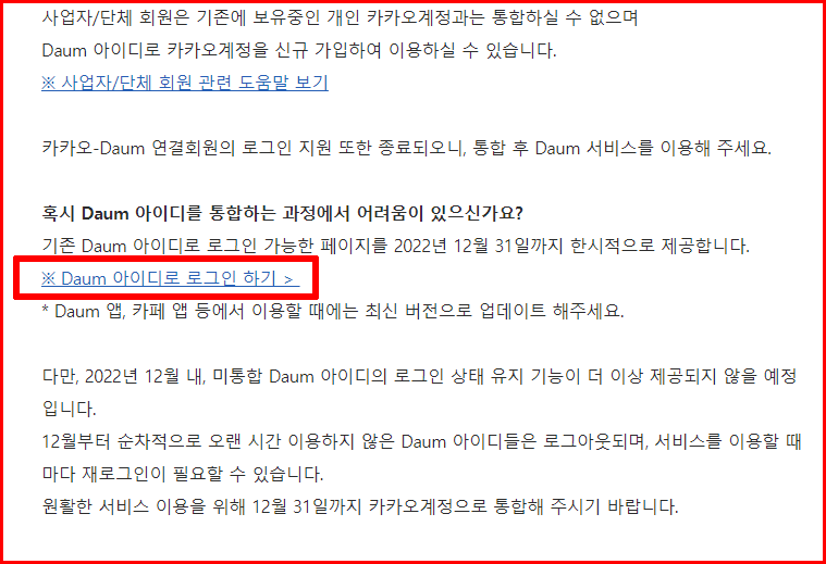 인내심을 가지고 내려가면, 참고표와 함께 'Daum 아이디로 로그인 하기' 링크를 만납니다. '원활한 서비스 이용을 위해 12월 31일까지 카카오계정으로 통합해 주시기 바랍니다'라는 간곡한 권유가 나오는 그 위쪽에 있습니다.